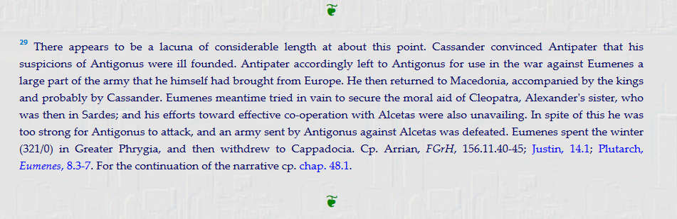 Η μετάφραση από τις εκδόσεις Loeb, του Χάρβαρντ αναφέρει με την υποσημείωση 29 πως στο συγκεκριμένο σημείο λείπει σημαντικό κομμάτι.