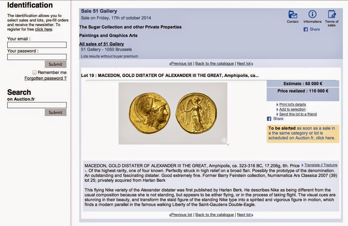 Τελευταία δημοπρασία πραγματοποιήθηκε σε οίκο στις Βρυξέλλες, όπου ένα νόμισμα με την κεφαλή του Μεγάλου Αλεξάνδρου, που είχε εκτιμηθεί για 2.000 ευρώ, πωλήθηκε αντί 3.800 ευρώ. Στον ίδιο οίκο ένα χρυσό νόμισμα, επίσης με τον Μέγα Αλέξανδρο, ο οποίος κρατά στεφάνι και από κάτω ακριβώς απεικονίζεται μία τρίαινα, ενώ είχε ήδη εκτιμηθεί στα 60.000 ευρώ, εκτοξεύθηκε στα 110.000 ευρώ. Οι τελευταίες μάλιστα πληροφορίες αναφέρουν πως μέχρι και τις 10 Δεκεμβρίου γίνονται χτυπήματα για σπάνια νομίσματα.